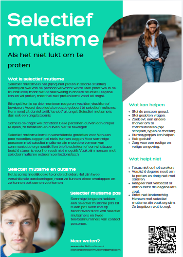 Speciaal voor instanties hebben we deze flyer gemaakt met uitleg over selectief mutisme en tips. Wij proberen deze flyer zoveel mogelijk te verspreiden zodat ook hier meer bekendheid komt over selectief mutisme.